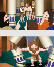 어느 날 블레셋 사람들은 그들이 섬기는 신 ‘다곤’에게 제사를 드릴 때, 삼손으로 하여금 재주를 부리게 하자고 했어요. 끌려나온 삼손은 옆에 있는 사람에게 부탁해서, 블레셋 사람들이 모여있는 다곤 신전의 두 기둥 사이에 세워달라고 부탁했어요. 삼손은 하나님께 부르짖었어요. “주 여호와여, 나를 생각하옵소서. 이번만 나를 강하게 하사 원수를 단번에 갚게 하소서.” 하나님은 삼손의 기도를 들으셨고, 그에게 힘을 주셨어요. 그 힘으로 신전의 기둥을 부숴버리자, 신전은 무너졌고 그곳에 있던 모든 블레셋 사람들이 모두 죽고 말았어요. 그렇게 해서 죽은 사람이, 삼손이 살아있을 때 죽인 사람보다 더 많았어요. | |