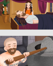 삼손이 자고 있을 때, 들릴라는 삼손의 머리카락을 잘랐어요. 그러자 블레셋 사람들이 그의 집 안으로 쳐들어 왔어요. 삼손은 그들을 물리치려 했지만, 이미 그의 힘은 사라지고 난 뒤였어요. / 블레셋 사람들은 삼손의 눈을 빼고, 사슬로 묶어 감옥에 가두고, 엄청나게 큰 맷돌을 돌리게 했어요. 비록 삼손의 힘은 없어졌지만, 그의 머리카락은 다시 자라기 시작했어요. |