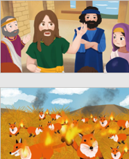어느덧 결혼식 날이 되었어요. 삼손은 자신의 결혼식에 참석한 블레셋 사람들에게 수수께끼를 내었어요. 이스라엘이 있는 중동 지역에서는 일주일 동안 결혼식이 진행되는데, 블레셋 사람들은 그 수수께끼를 맞출 수 없었어요. 결국 삼손의 아내인 블레셋 여인에게 찾아가서, 수수께끼의 정답을 알아오게 했어요. 덕분에 블레셋 사람들은 수수께끼를 맞출 수 있었지만, 이 일로 인해 삼손은 매우 화가 났어요. 그래서 아내를 두고, 다른 곳으로 떠났지요. 얼마 후 다시 돌아와 아내를 찾았지만, 이미 떠난 뒤였어요. / 또 화가 난 삼손은 여우의 꼬리를 묶어서 그 사이에 횃불을 놓고, 블레셋 사람들의 논밭과 과수원을 모두 불타게 했어요. |
