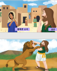 어른이 된 삼손은, 이스라엘을 괴롭히는 블레셋의 여인과 결혼하고 싶어 했어요. 하나님께서는 일찍이 이스라엘 백성들에게, 이방 나라 사람과 결혼하지 않도록 말씀하셨어요. 그런데도 삼손은 블레셋 여인을 만나기 위해 자신의 부모님과 함께 ‘딤나’라는 지역으로 갔어요. / 길을 갈 때에 사자가 덤벼들었고, 삼손은 그 사자를 맨손으로 죽였어요. 며칠 후 결혼식을 하기 위해 딤나로 가는 길에, 자신이 죽였던 사자의 사체를 보았어요. 그 사체 안에는 벌떼와 꿀이 있었어요. 삼손은 그 안에 있던 꿀을 맛있게 먹었고, 부모님에게도 가져다 드렸어요. | |